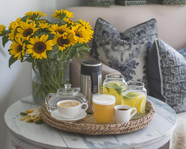 • A tray with tea, coffee, or lemonade creates a sense of hospitality