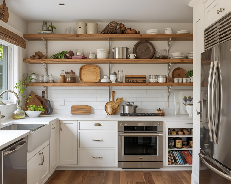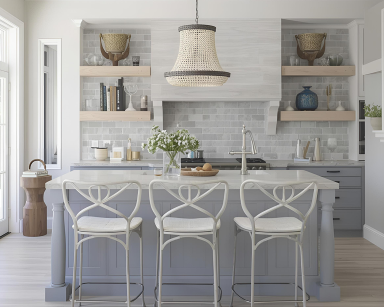 Open shelving is more than a trend—it’s a functional way to showcase personality. In the Lowcountry, it’s common to see shelves adorned with handmade pottery, jars of local spices, or baskets of fresh herbs. Open shelving: